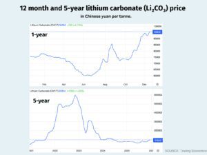 Lithium prices have rebounded sharply over the past year, and the chart below shows just how powerful the move has been particularly when viewed against the longer-term five-year trend. But as the lithium carbonate price charts also make clear, this remains a boom-bust commodity, and equity markets often move faster than the underlying fundamentals.